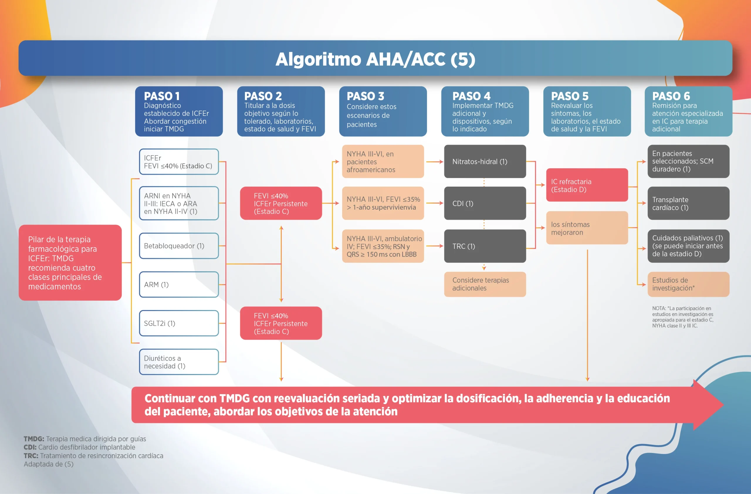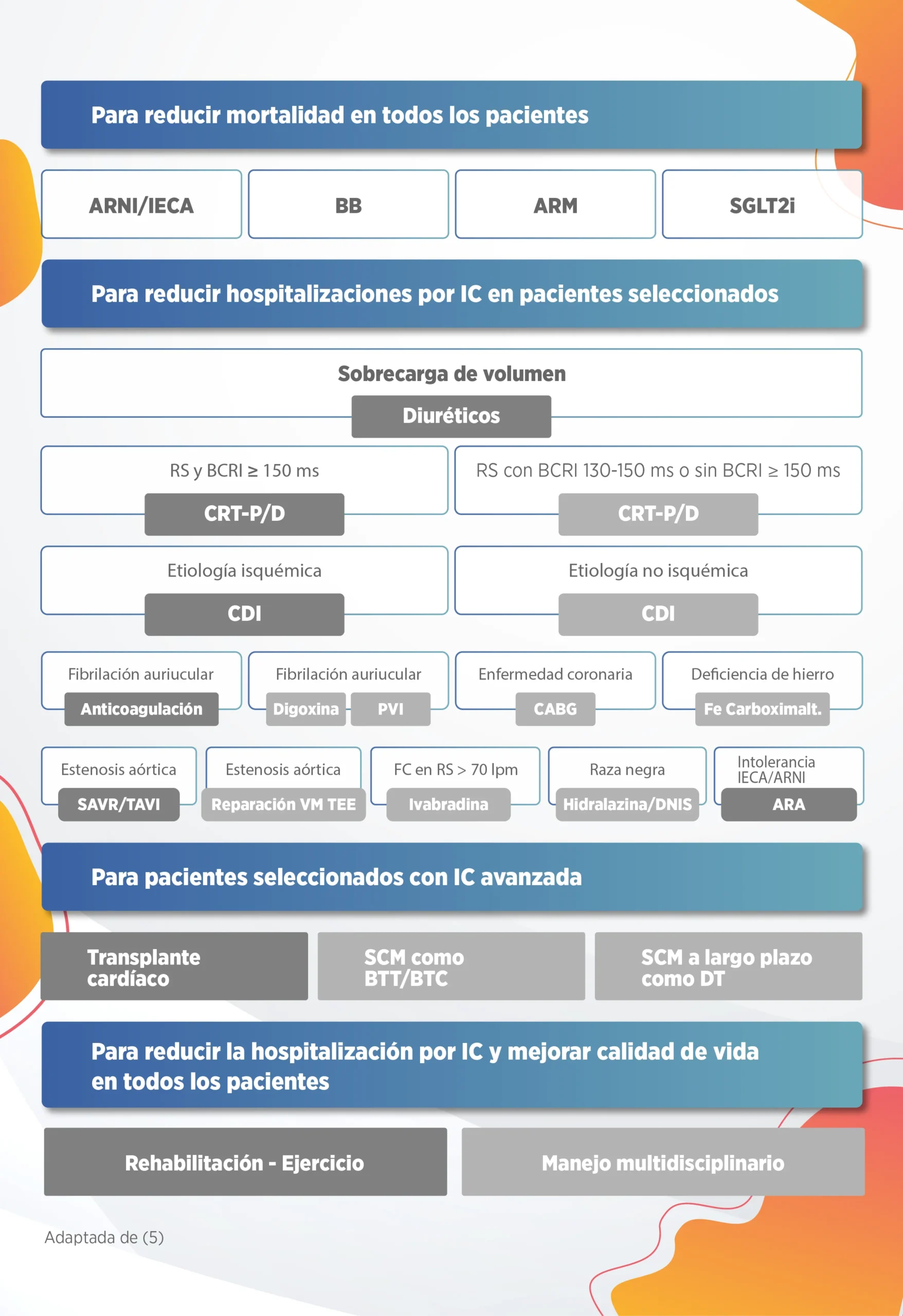 En los últimos dos años se han actualizado las guías internacionales de la enfermedad y el consenso colombiano de ICFEr, privilegiando el uso de una terapia horizontal basada en cuatro grupos farmacológicos: antagonista receptor neprilisina- angiotensina (ARNI), Betabloqueadores (BB), antagonistas del receptor de mineralocorticoide (ARM) e iSGLT2.