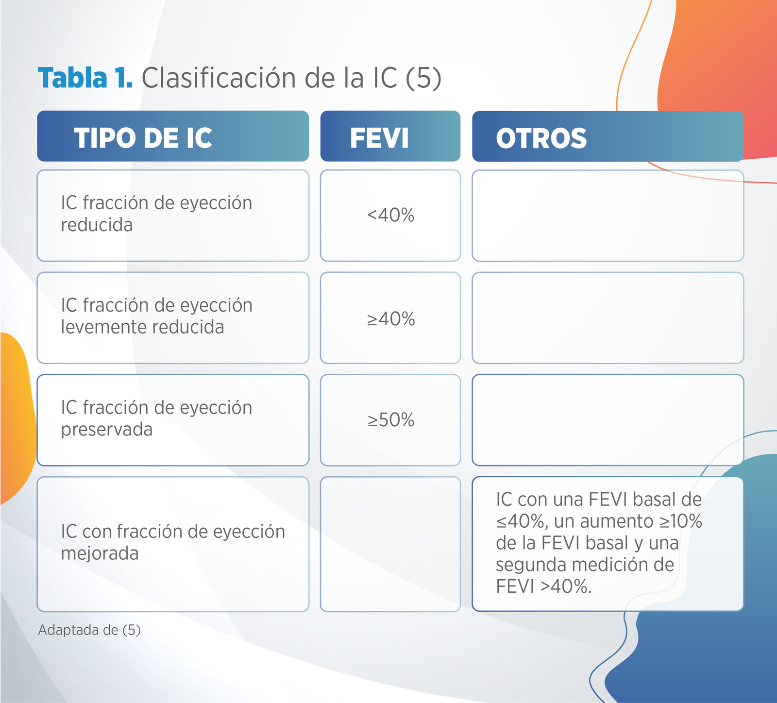 Alrededor de la mitad de todos los pacientes con insuficiencia cardiaca tienen una fracción de eyección reducida (ICFEr), también referida como insuficiencia cardiaca sistólica. 1,2,3 En estos pacientes, el ventrículo izquierdo está dilatado y hay un incremento en el volumen ventricular izquierdo tanto diastólico como sistólico final. La dilatación ventricular progresiva está asociada con el empeoramiento de la enfermedad y un mal pronóstico. La insuficiencia cardiaca diastólica se caracteriza por los signos y síntomas de insuficiencia cardiaca, fracción de eyección ventricular izquierda (FEVI) preservada y una función diastólica anormal. Los pacientes se pueden clasificar como insuficiencia cardiaca con fracción eyección reducida (ICFEr), Insuficiencia Cardíaca con Fracción Eyección preservada (ICFEp), Insuficiencia Cardíaca levemente reducida (ICFElr) e Insuficiencia Cardíaca con fracción de eyección mejorada (ICFEm) según se define en la tabla 1. 2,5
