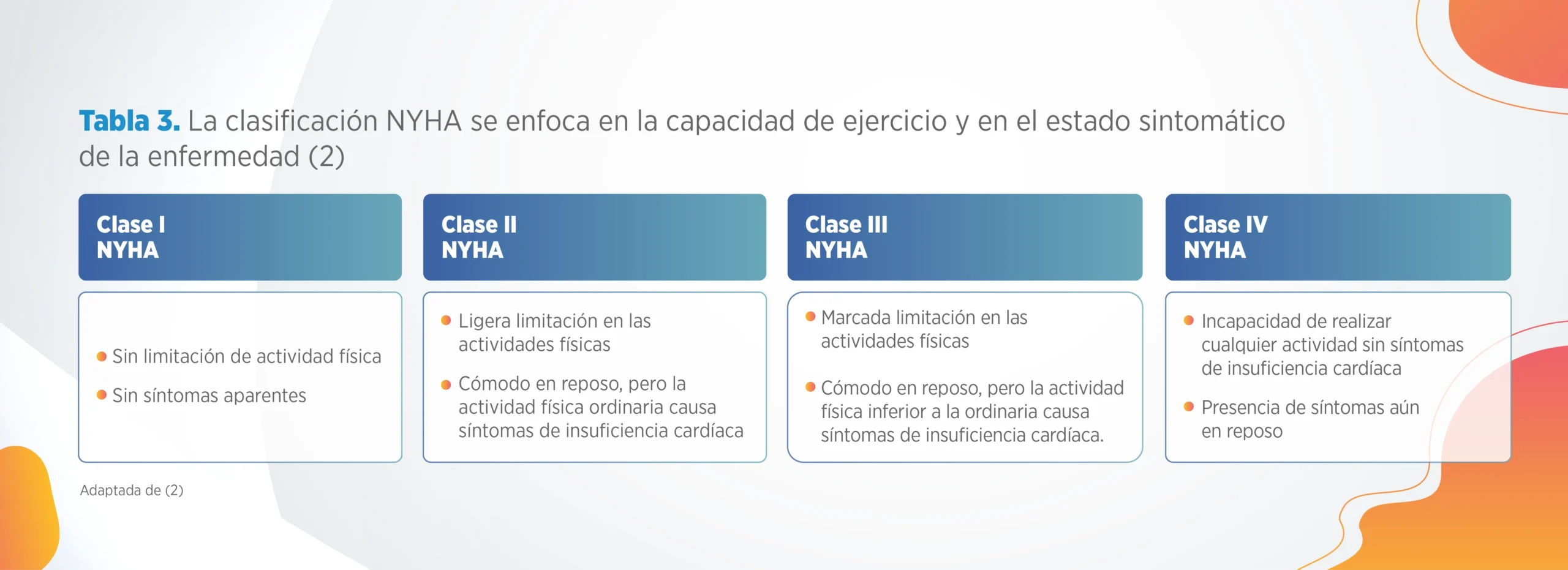 El sistema de clasificación NYHA (Asociación Del Corazón De Nueva York) enfatiza la capacidad de ejercicio y el estado sintomático de la enfermedad (tabla 3), y puede cambiar (incrementarse o disminuir) durante el manejo o la progresión de la enfermedad. Es una evaluación clínica subjetiva que se utiliza ampliamente en la práctica clínica y en la investigación para clasificar la gravedad de la insuficiencia cardiaca de acuerdo con el grado de disnea (con esfuerzo o en reposo).